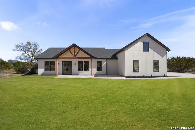 Welcome home to this beautifully crafted newly built modern residence situated on 2.01 acres in Bandera, Texas, offering the perfect blend of luxury, space, and Hill Country living. Thoughtfully designed with an open-concept layout, this home showcases quality craftsmanship and high-end finishes throughout. Vaulted and coffered ceilings enhance the spacious feel of the main living areas, while hardwood flooring spans the main level, including all bedrooms. The heart of the home opens into a bright and inviting living space, ideal for both everyday living and entertaining. The gourmet kitchen is a true centerpiece, featuring an oversized island, custom cabinetry, and a full THOR appliance package, including the refrigerator. A gas range, custom vent hood, and decorative sconce lighting framing the kitchen window combine style with functionality. The primary suite is conveniently located on the main level, offering a private retreat with ample space and comfort. An additional secondary suite upstairs provides flexibility for guests, extended family, or a private living area. This 4-bedroom, 3.5-bath home is turn-key and move-in ready, and includes a 1-2-10 builder warranty for added peace of mind. Outside, the expansive 2.01-acre lot provides privacy, room to roam, and endless potential for outdoor living, future enhancements, or simply enjoying the peaceful surroundings of the Texas Hill Country. This property presents a rare opportunity to own a high-quality new construction home on acreage-truly a must-see to appreciate the design, space, and setting.