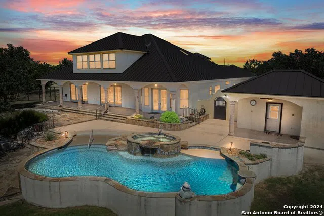 VIEWS & PRIVACY abound with this custom Mediterranean Hill Country Estate in the gated community of The Horizon. Impeccable attention to detail w/the custom design, built-in cabinetry, woodwork & open floor plan. An entertainers dream that includes: a full bar w/sink, dishwasher, ice machine & wine fridge; custom pool with beach entry, hot tub & pool house w/full bath & outdoor shower. The chef's dream kitchen is complete w/commercial range & refrigerator, large island, 2 sinks, pot filler & is loaded w/custom cabinet storage features. All living can be done on the 1st level if desired w/gorgeous master suite overlooking the pool area & ensuite bath w/large walk-in closet & frosted glass shower and vessel sinks. Vessel sinks throughout home & stunning turquoise sink in powder bath. Upstairs amenities include kitchenette, large open area that is perfect for a media room, bedroom, full bath and 2 addition rooms that can be used as bedrooms, an office, or craft/artist studio. The separate guest casita is perfect for company or for a college aged student. Detached shop has a full bath w/shower, RV sized OH door & rainwater catchment system. Make this your Texas Hill Country dream home!